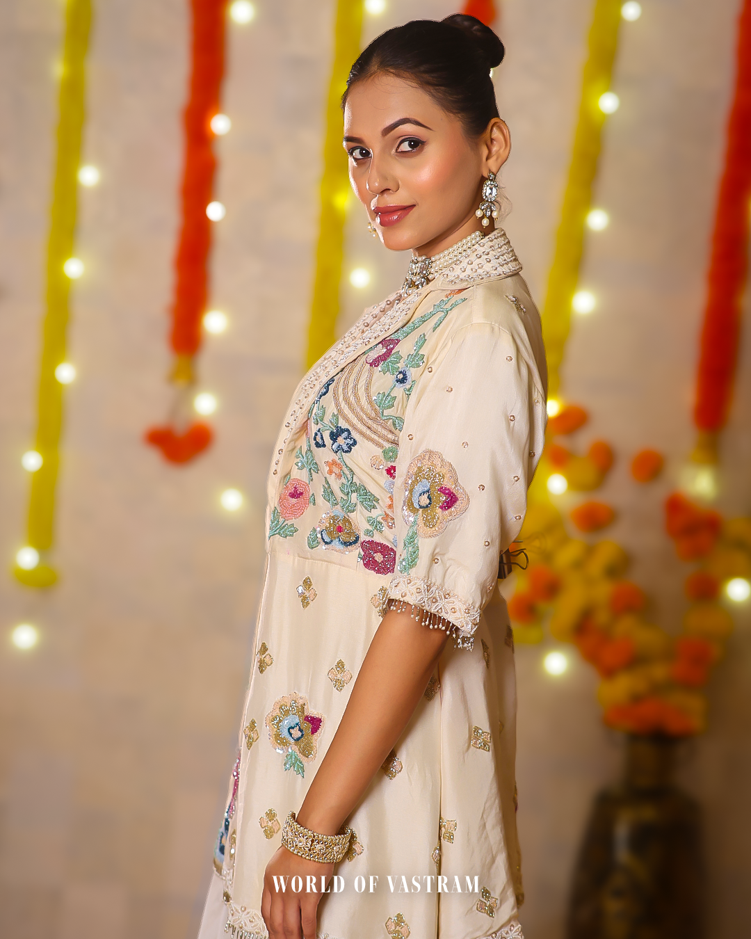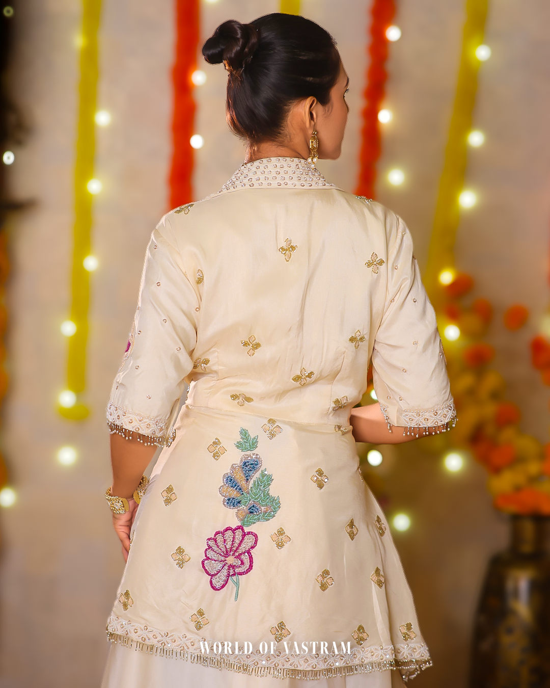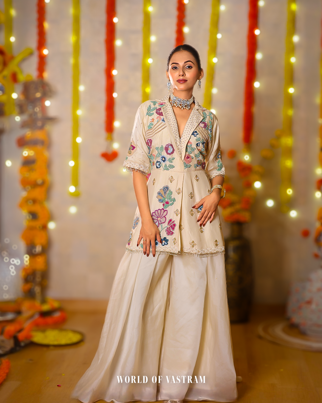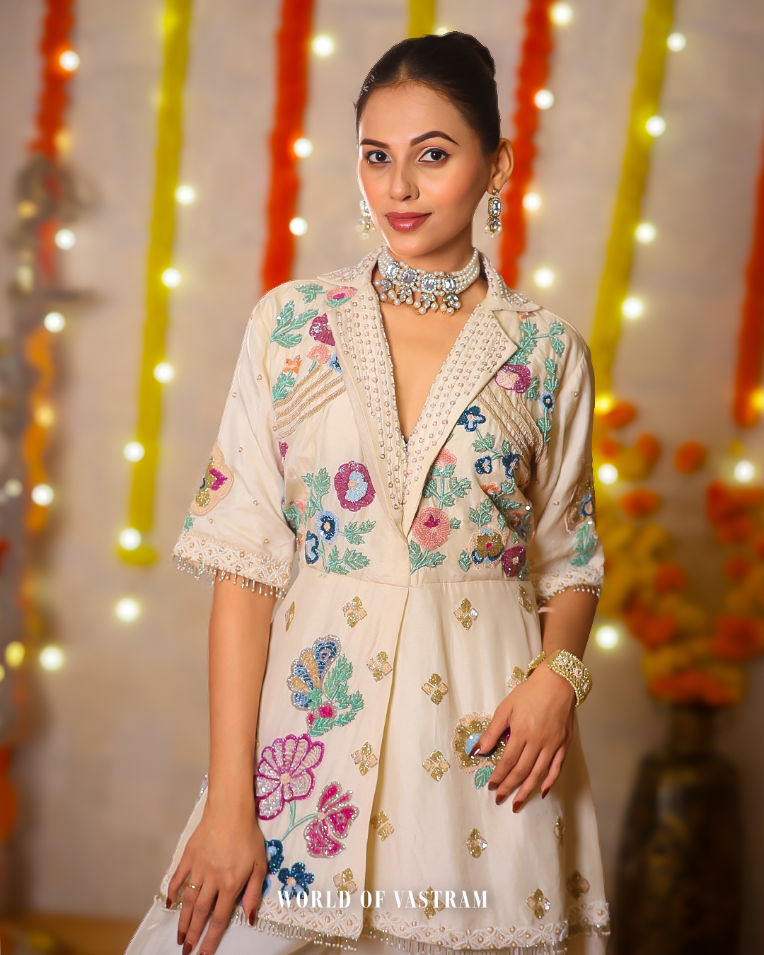 The outfit features a front-open embroidered jacket adorned with multicolored floral motifs and intricate mirror work, adding a vibrant yet graceful touch. The delicate bead and sequin detailing along the neckline and hem enhances its festive appeal. Paired with flowy flared palazzos