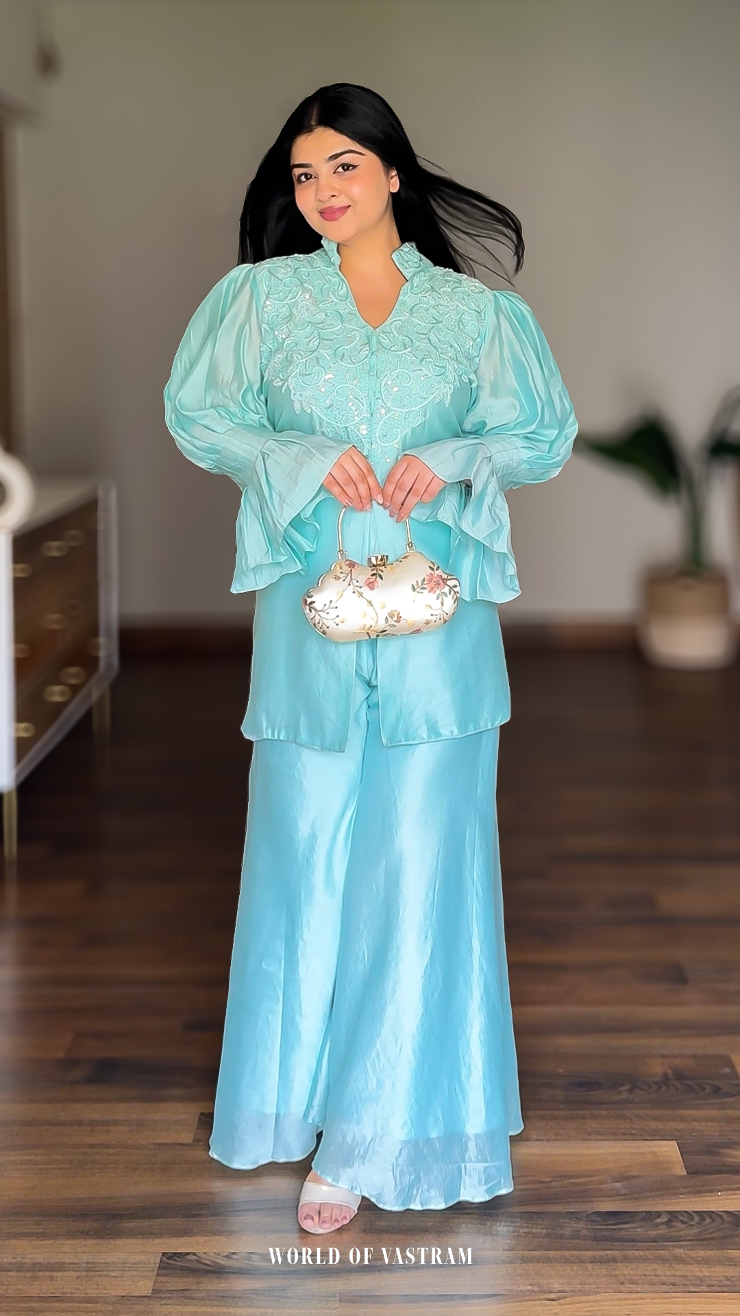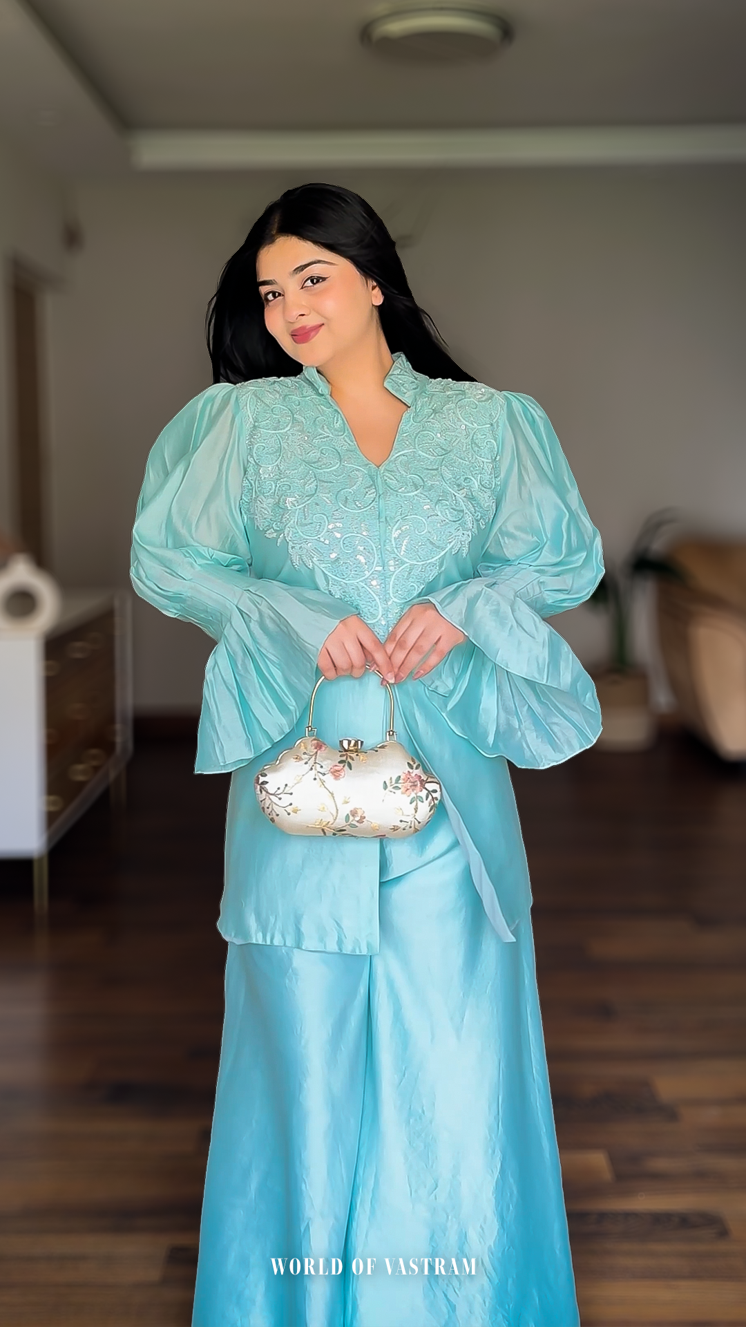 A long tunic-style top with a front slit, featuring delicate tone-on-tone embroidery on the bodice. The top has full sleeves with dramatic layered bell cuffs, adding a flowy and contemporary touch. Wide-legged palazzo pants made of a shiny, lightweight fabric that flows beautifully, giving an elegant and breezy vibe.