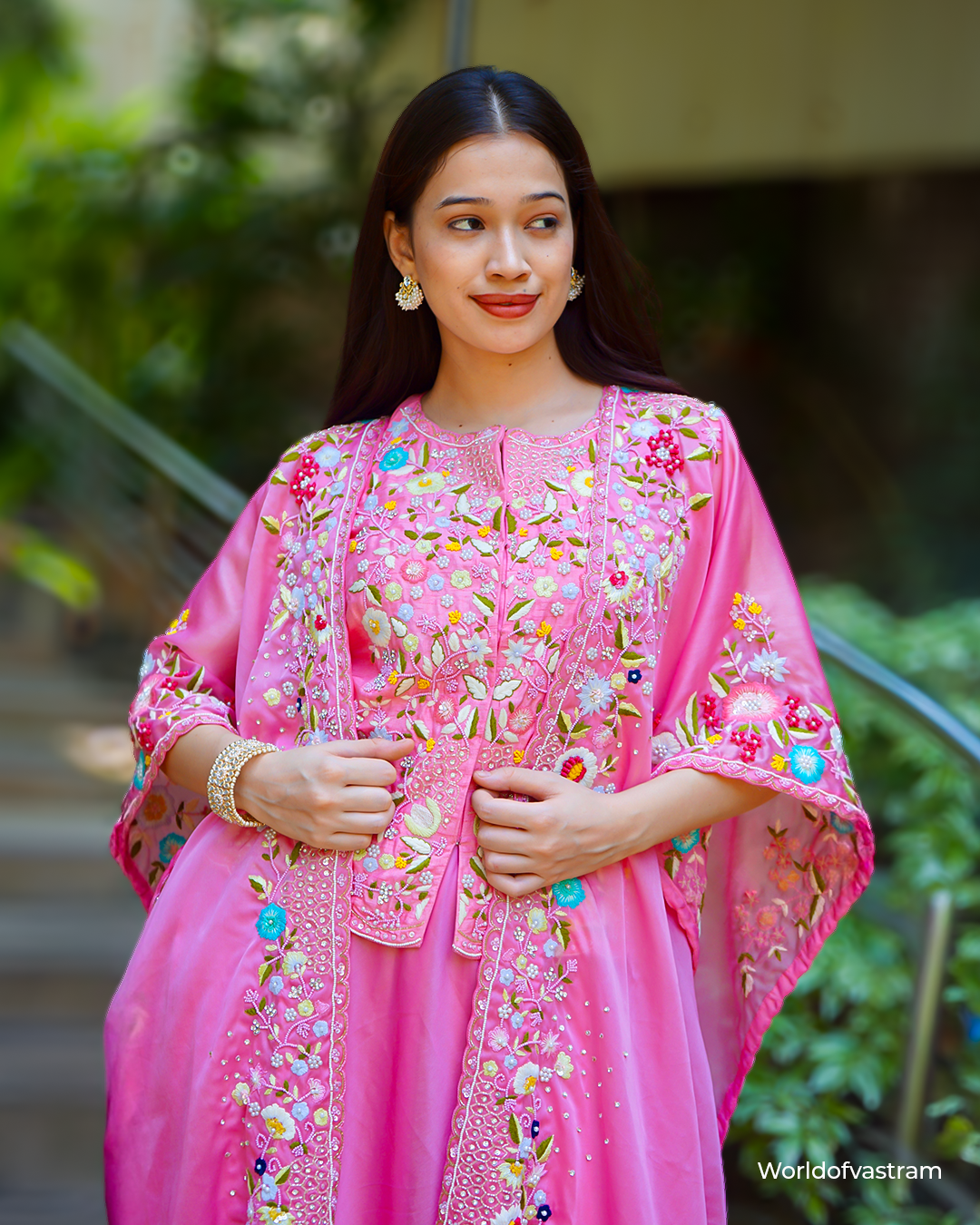 The embroidery includes mirror work and delicate threadwork, creating a vibrant, festive, and elegant look. The silhouette is flowy and relaxed, making it perfect for daytime festivities, haldi or mehendi ceremonies, or a garden-themed celebration.