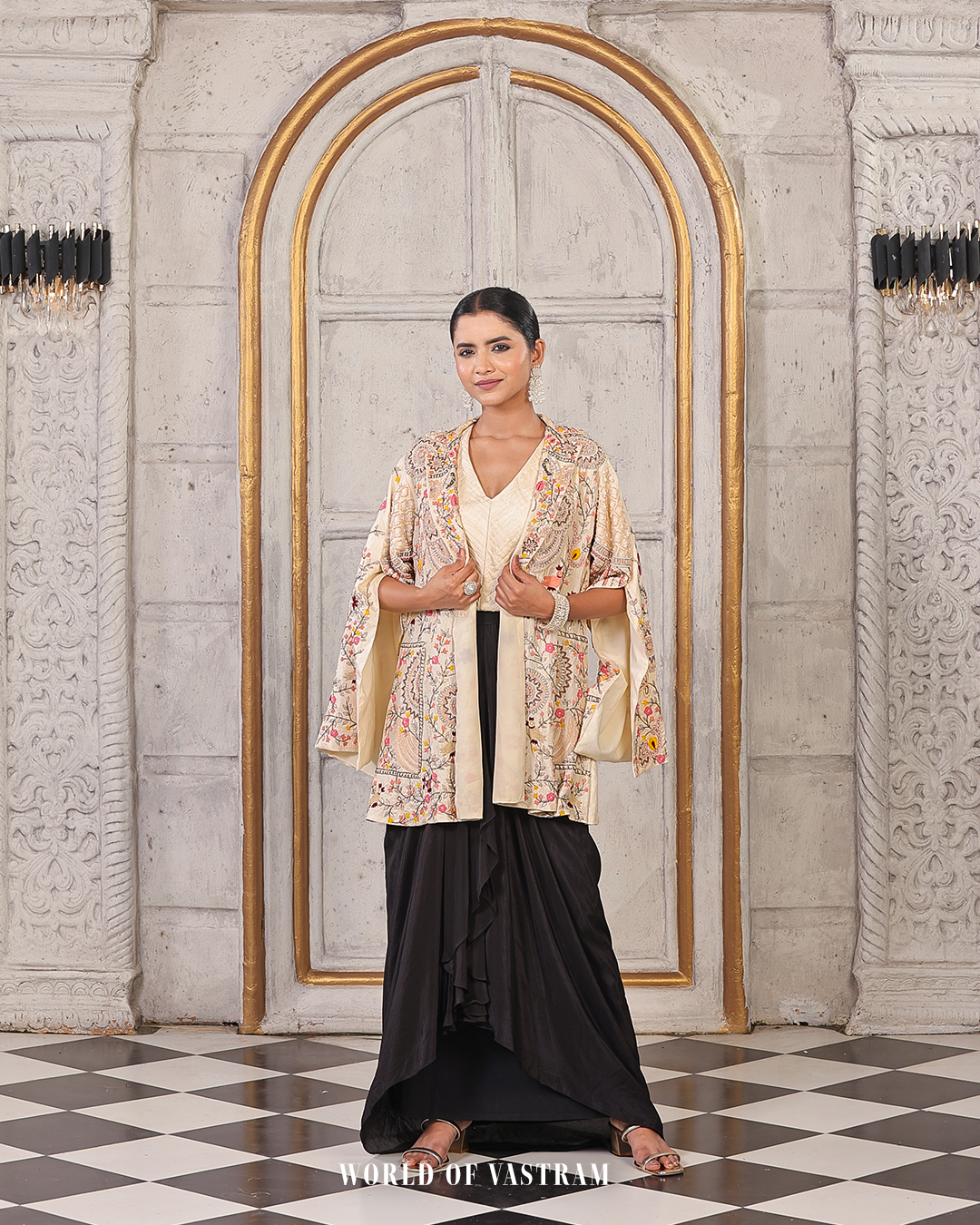 The look features a hand-embroidered ivory jacket, layered over a soft beige inner and paired with flowy black Draped Skirt. The jacket is adorned with intricate, multicoloured floral and paisley embroidery, inspired by traditional craftsmanship yet styled in a modern, relaxed silhouette.