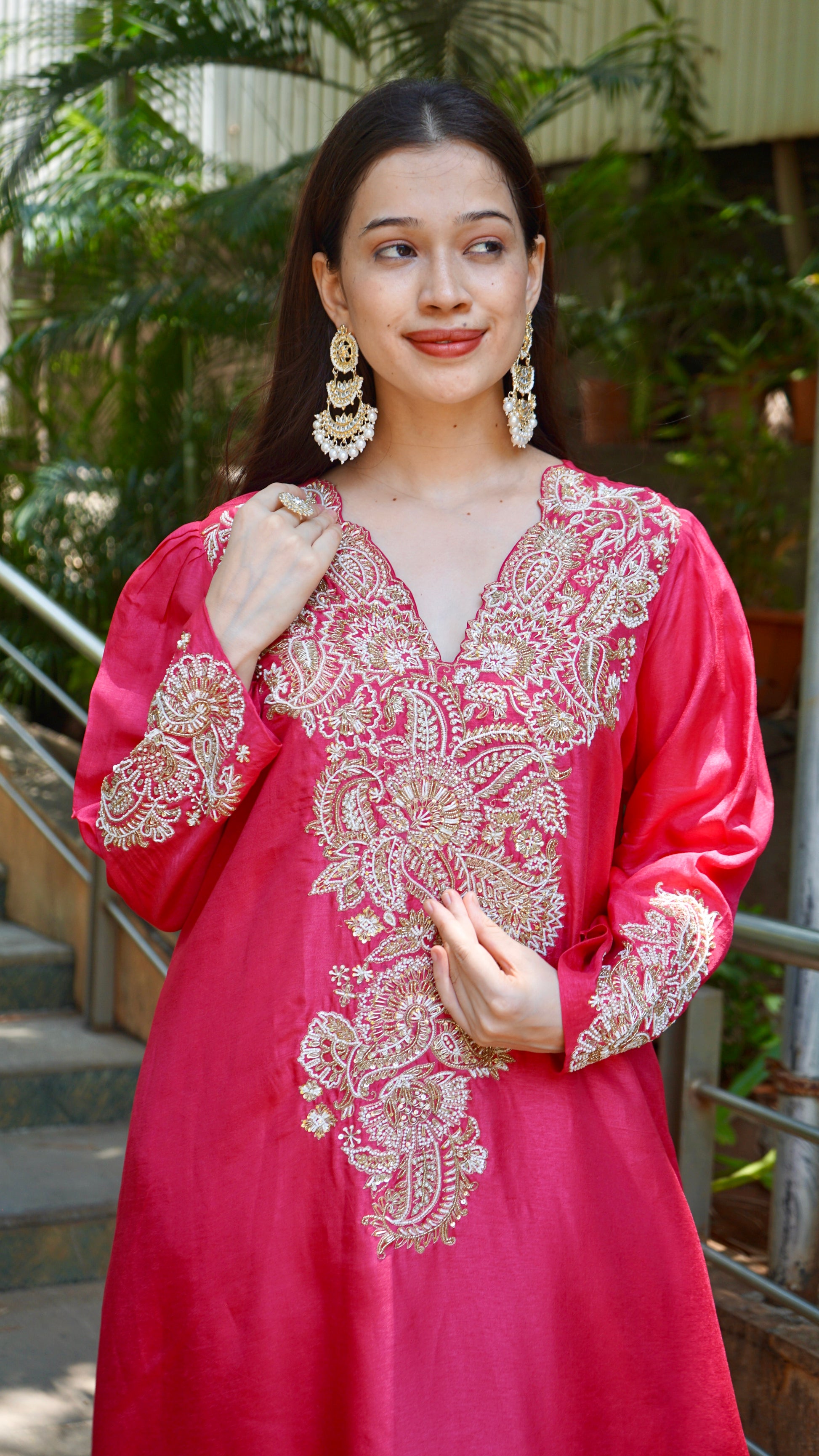 Crafted in luxurious silk fabric, the outfit features exquisite golden zari and thread embroidery along the neckline, sleeves, and front panel — adding a regal touch to its vibrant hue. Paired with a matching salwar for effortless comfort, this ensemble is the perfect choice for weddings, festive occasions, or elegant celebrations. ✨